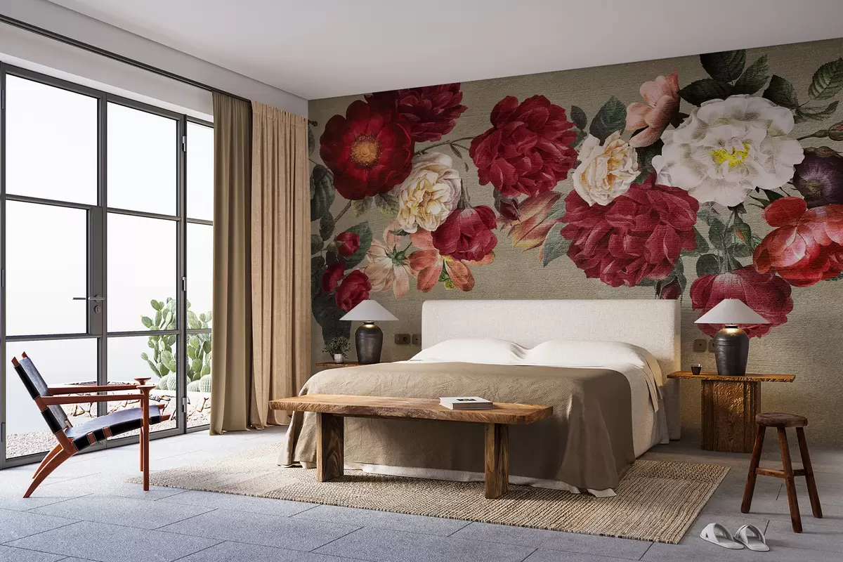 Fotomurales Arte vintage flores vibrantes con hojas sobre un fondo de textura neutra Nr. w07929