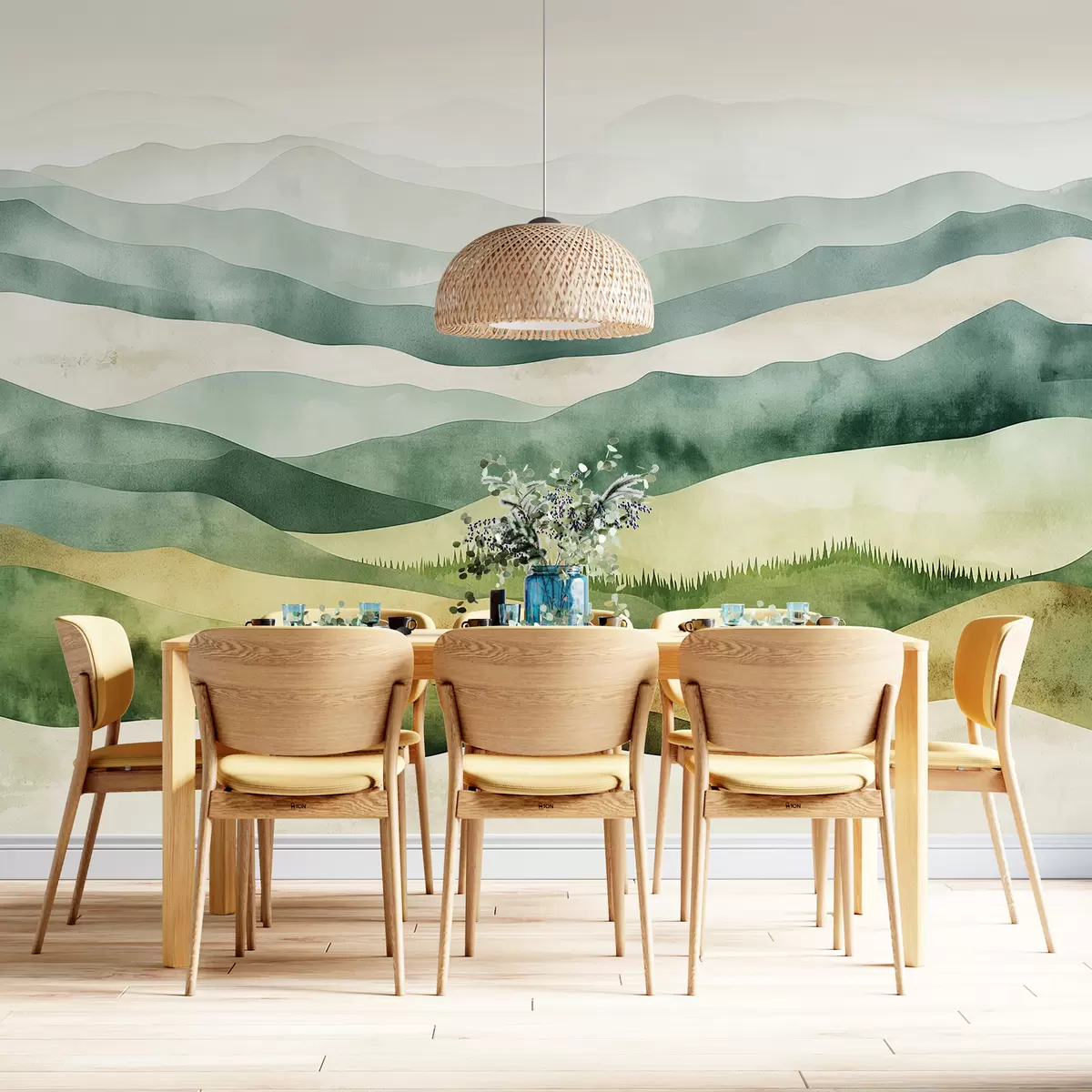 murales de pared Paisajes de montañas acuarelas, bosques, colores verdes y beige naturales. w07950