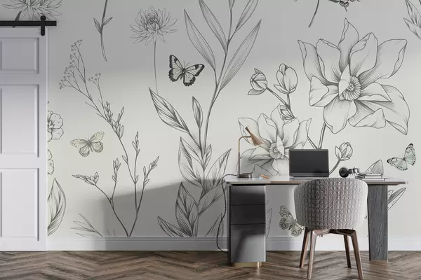Fotomurales Boho flores y mariposas monocromáticas. Nr. w08088