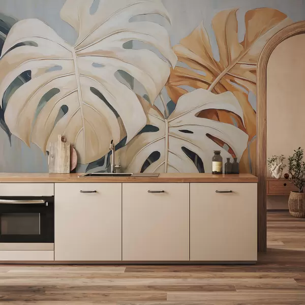 Fotomurales Hojas de monstera, color azul, blanco, naranja. Nr. w08124