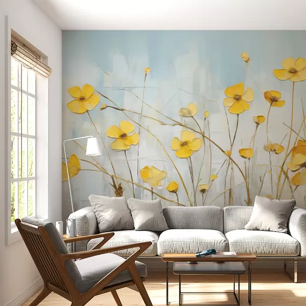 Fotomurales Pequeñas flores amarillas sobre pintura al óleo azul. Nr. w08129