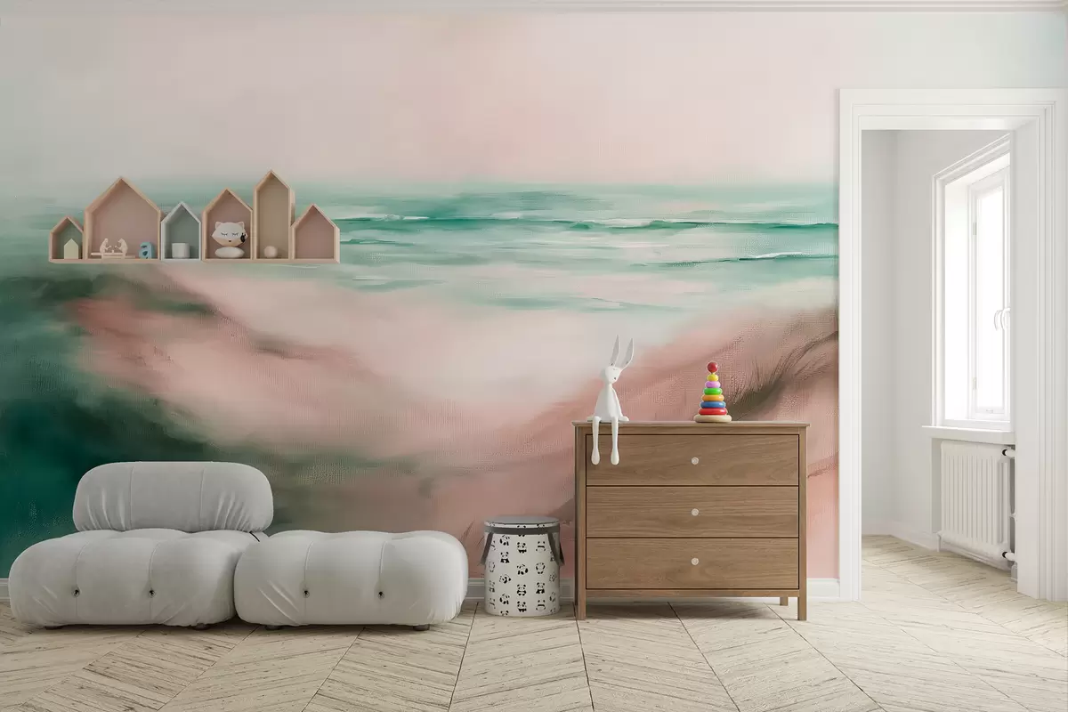 Fotomurales Paisaje abstracto en colores pastel, playa, mar, paleta de colores aguamarina y rosa, pinceladas Nr. w08141v2