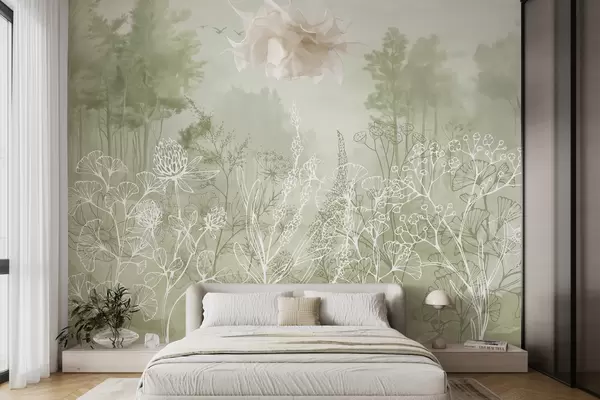 Fotomurales Dibujo lineal de flores, paisaje forestal, naturaleza, realismo, paleta de colores verde. Nr. w08144v2