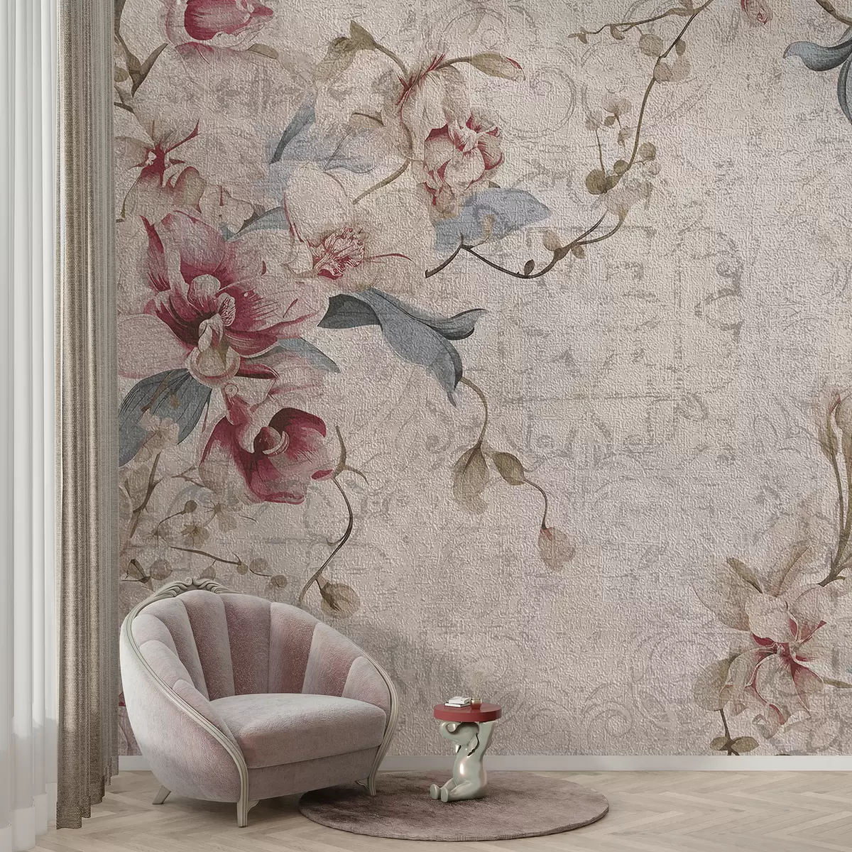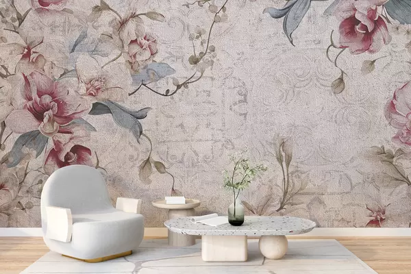 murales de pared Un patrón floral vintage con delicadas flores rosas y blancas, hojas sobre un fondo beige claro. w08149