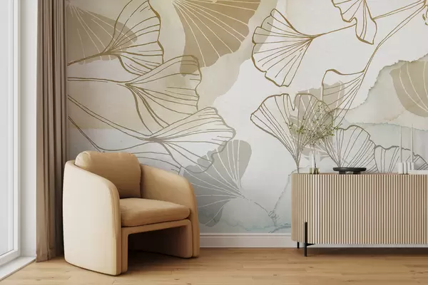 Fotomurales Un patrón de delicadas hojas de ginkgo en tonos beige, tostado y azul sobre un fondo claro. Nr. w08157
