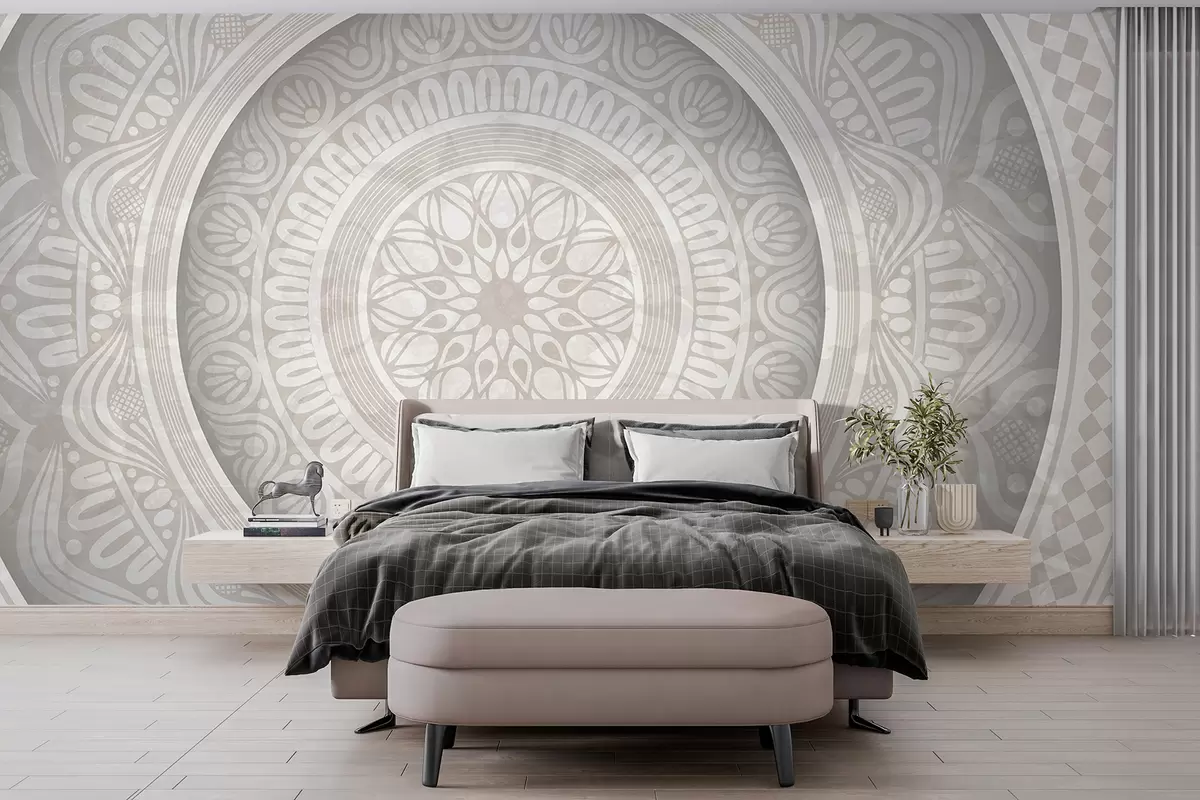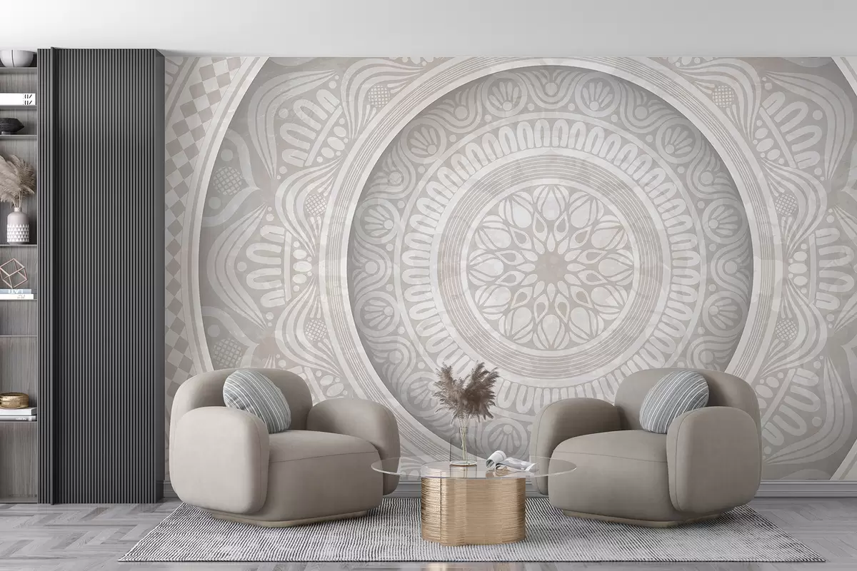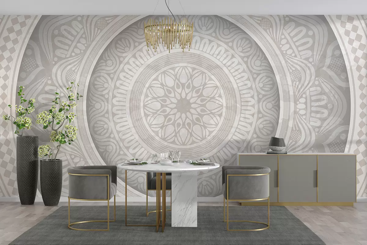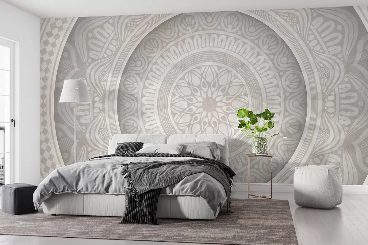 Fotomurales Un estampado de mandala gris y blanco simétrico y detallado con círculos concéntricos y formas geométricas. Nr. w08182