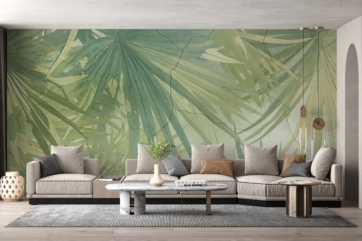 Fotomurales Follaje tropical exuberante con grandes hojas de palmeras verdes sobre un fondo suave y brumoso. Nr. w08187