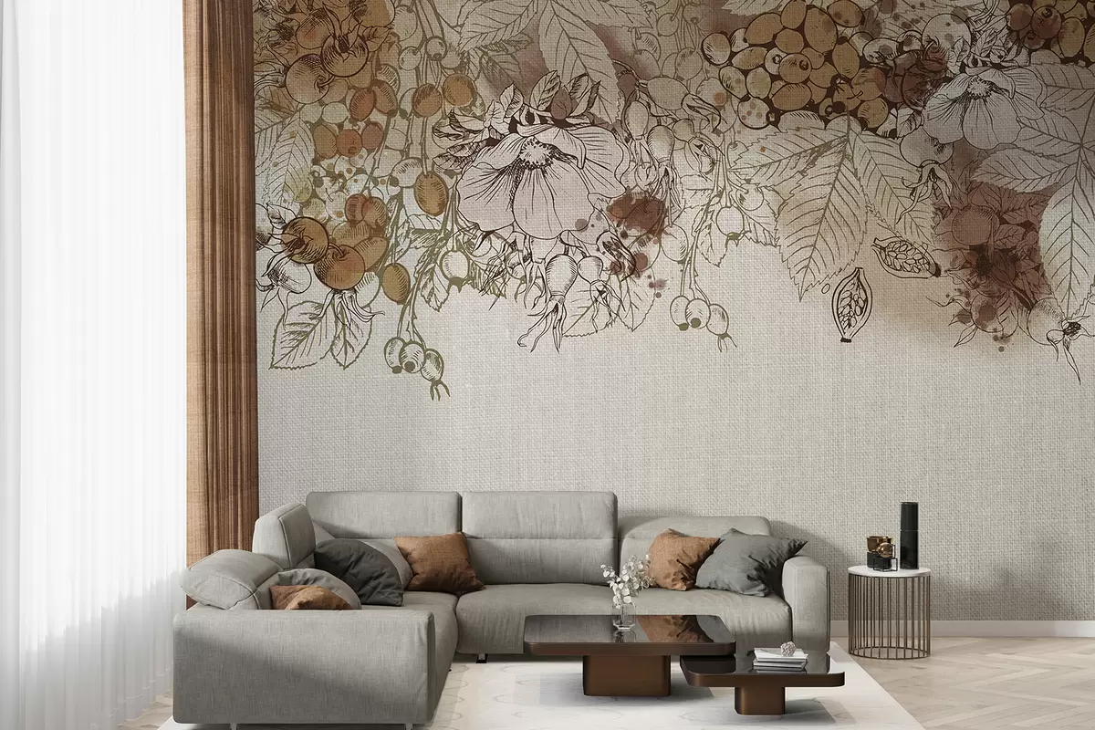Fotomurales Hojas de otoño y otros elementos naturales dispuestos en una impresión decorativa sobre un fondo texturizado. Nr. w08190