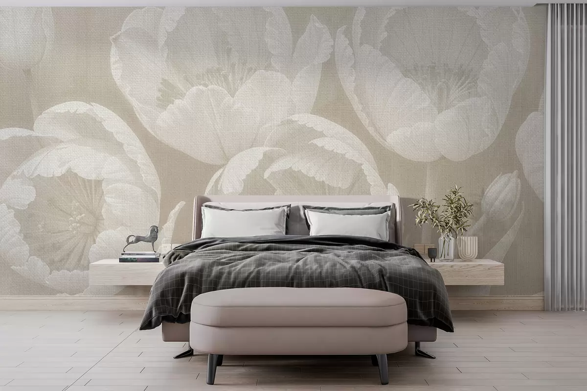 Fotomurales Dibujo de tulipanes blancos con fondo borroso rosa con textura de lienzo suave, impresión monocromática minimalista Nr. w08193v1