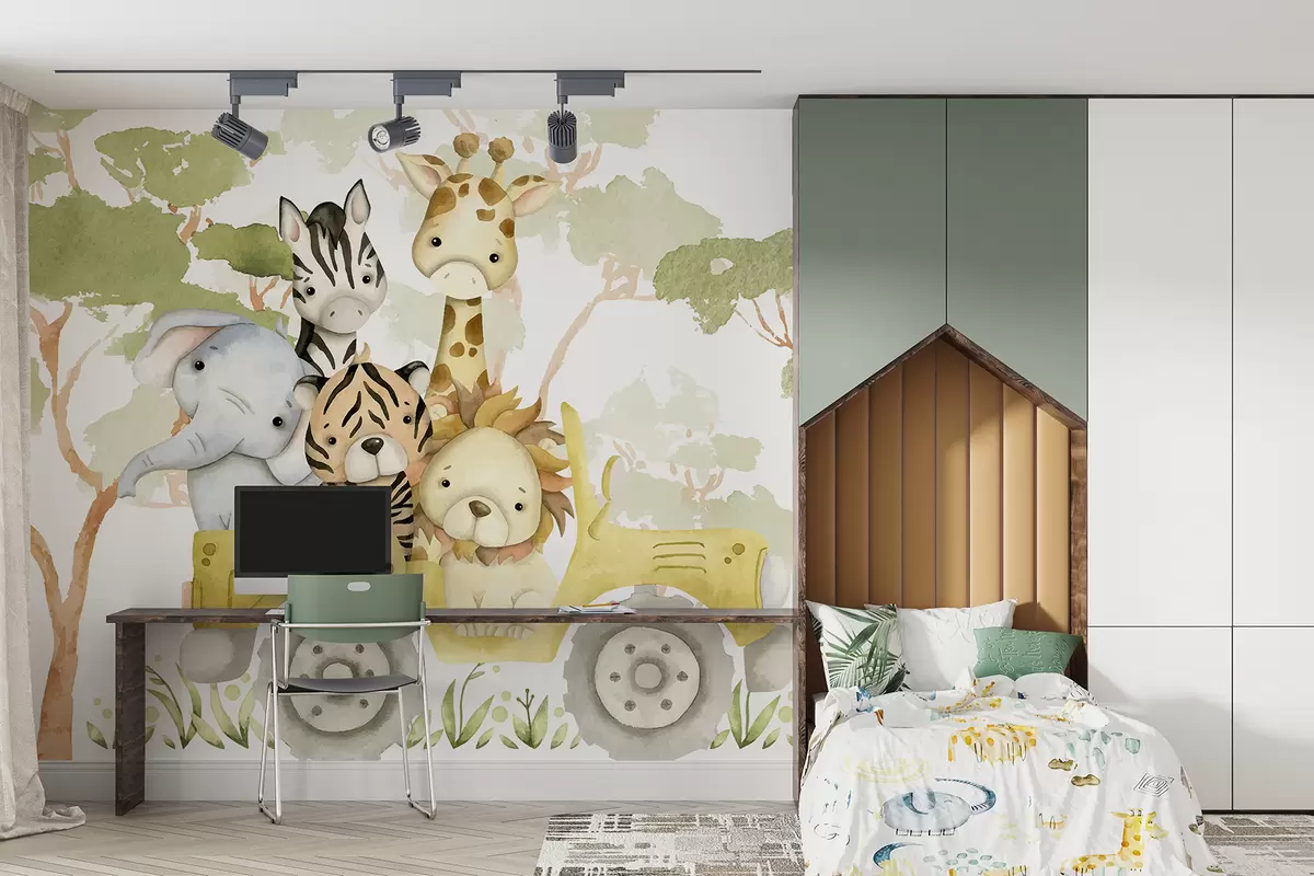 Fotomurales Un camión de juguete amarillo que transporta una jirafa, un tigre, un conejo y un elefante, sobre un fondo de follaje verde. Nr. w08233