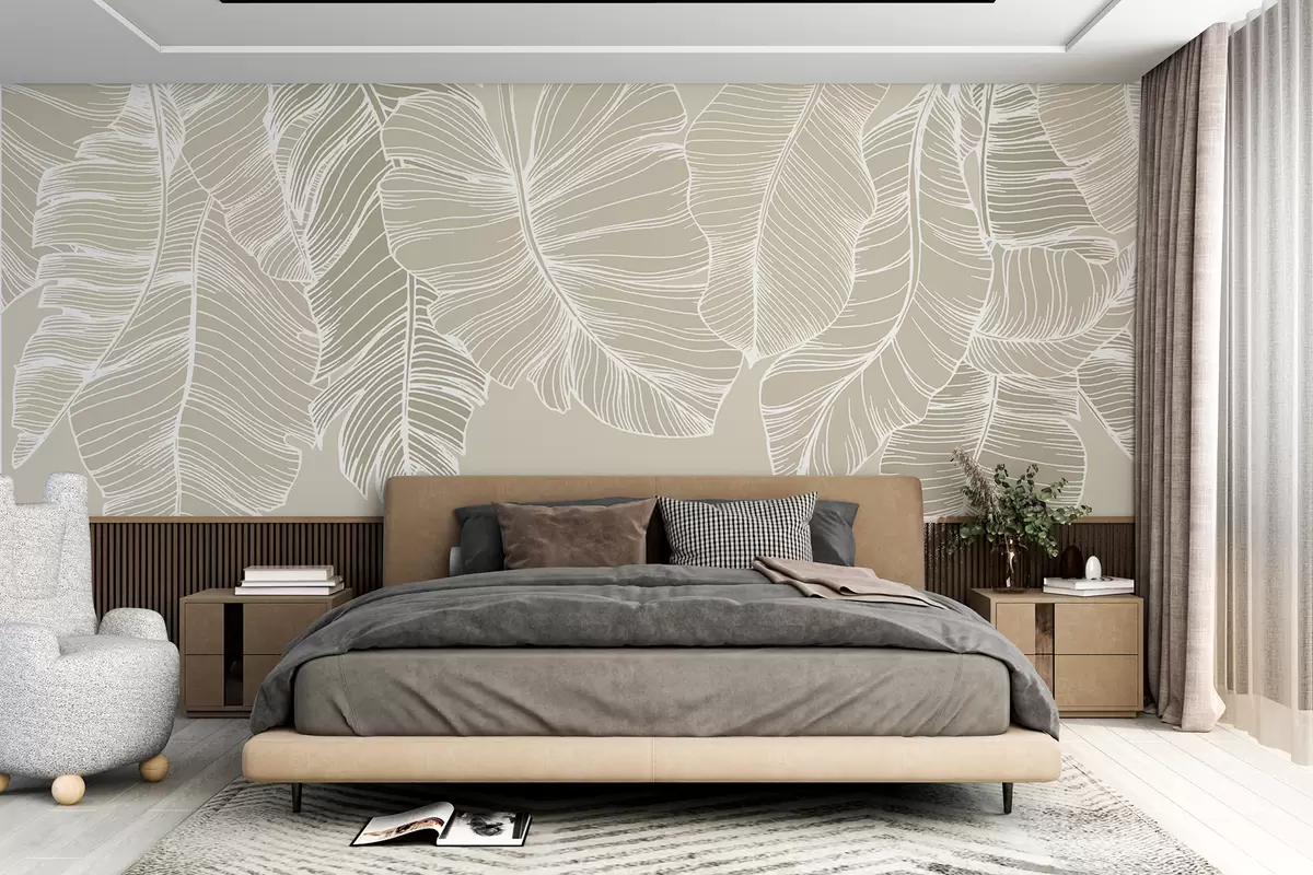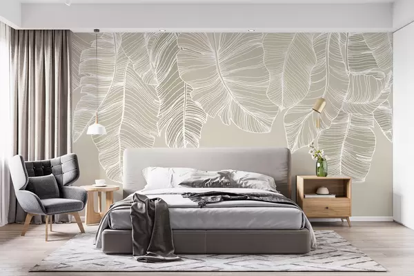 Fotomurales Hojas florales tropicales blancas con fondo beige claro, diseño de arte lineal minimalista. Nr. w08235