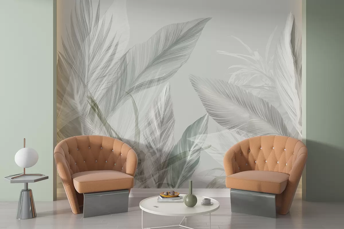 Fotomurales Suaves plumas blancas, verdes y grises y hojas tropicales flotando sobre un fondo claro. Nr. w08241