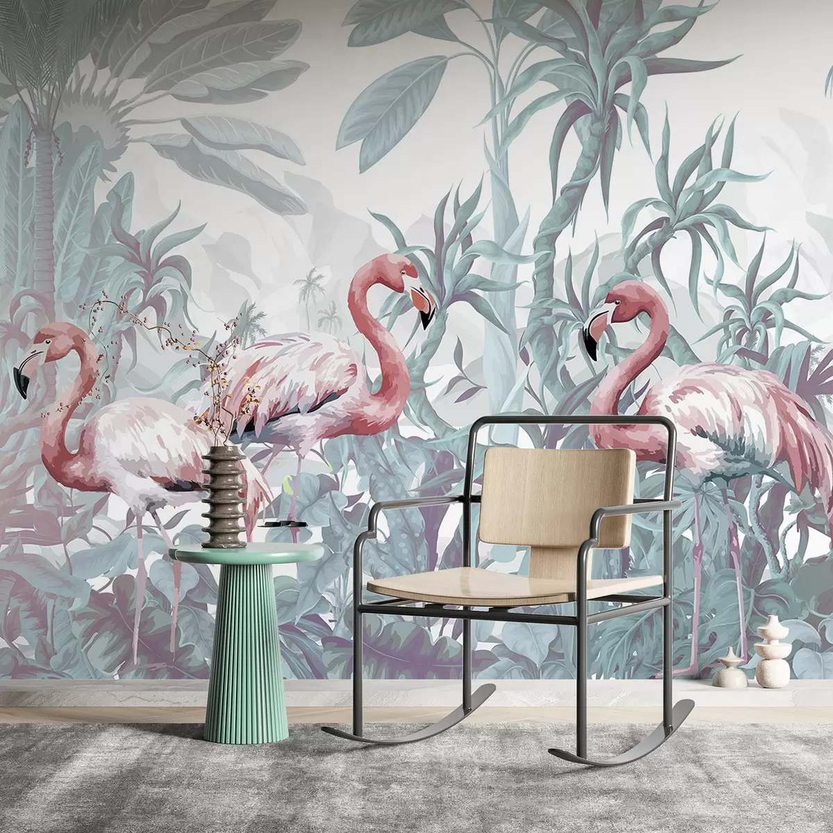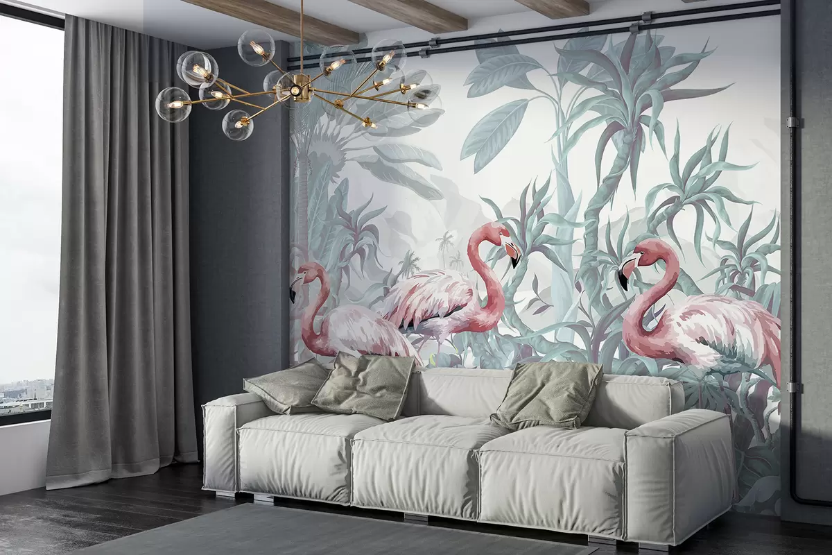 Fotomurales Flamencos rosas de pie en un exuberante follaje tropical con grandes hojas de palmera y flores en tonos verdes y blancos Nr. w08250v1