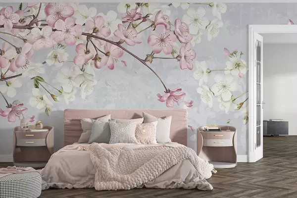 Fotomurales Flores de cerezo rosas y blancas en plena floración, con suaves pétalos que caen sobre un fondo azul texturizado Nr. w08254