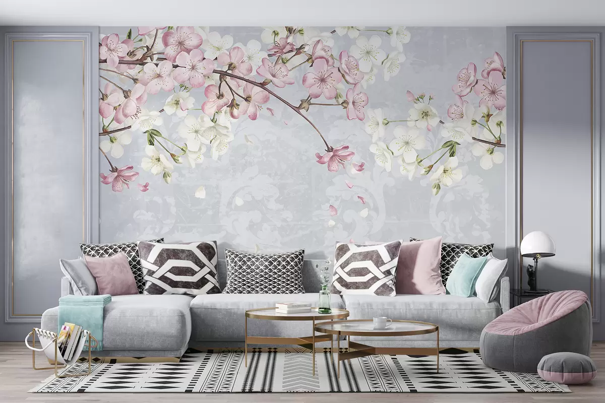 Fotomurales Flores de cerezo rosas y blancas en plena floración, con suaves pétalos que caen sobre un fondo azul texturizado Nr. w08254