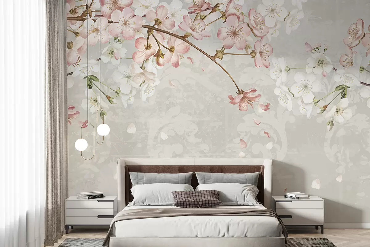 Fotomurales Flores de cerezo rosas y blancas en plena floración, con suaves pétalos que caen sobre un fondo beige texturizado Nr. w08254v1
