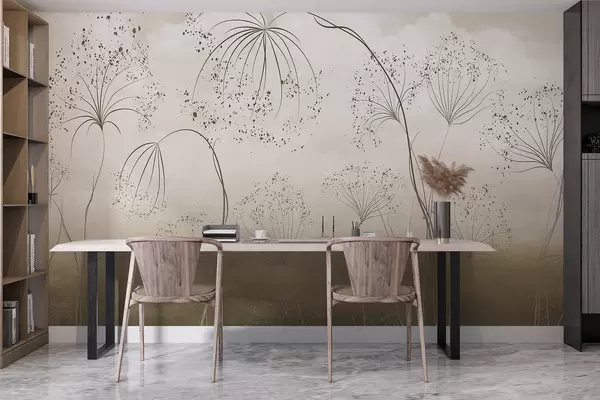 Fotomurales Plantas marrones, altas y tenues, con delicadas flores en forma de paraguas o cabezas de semillas en un entorno atmosférico y brumoso Nr. w08258