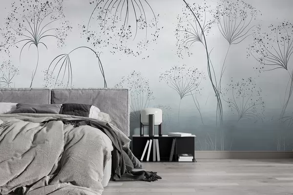Fotomurales Plantas azules, altas y tenues, con delicadas flores en forma de paraguas o cabezas de semillas en un entorno neblinoso y atmosférico Nr. w08258v1