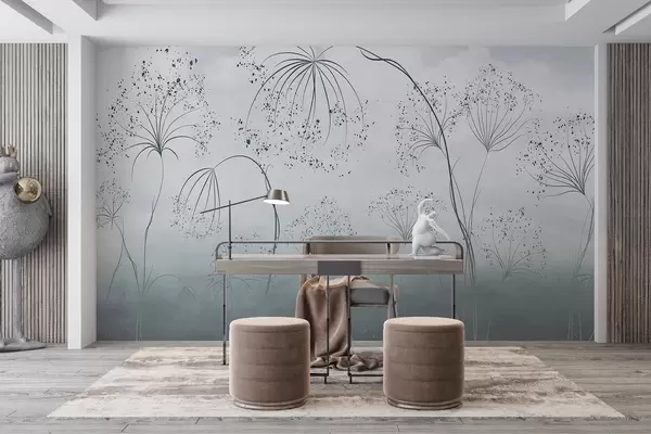 Fotomurales Plantas azules, altas y tenues, con delicadas flores en forma de paraguas o cabezas de semillas en un entorno neblinoso y atmosférico Nr. w08258v1