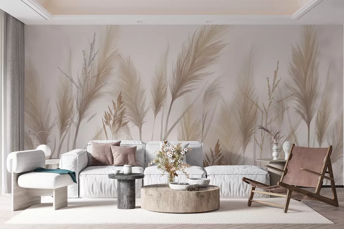 Fotomurales Altas espiguillas de hierba beige mecidas por el viento sobre un fondo suave y claro Nr. w08268