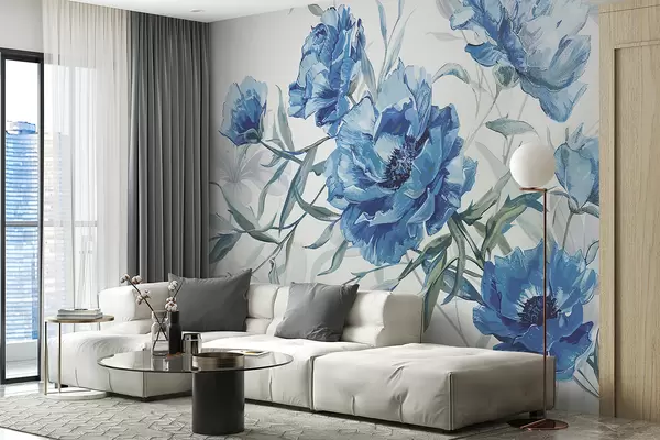 Fotomurales Pintura de peonías azules con exuberante follaje sobre un fondo abstracto claro Nr. w08274v1