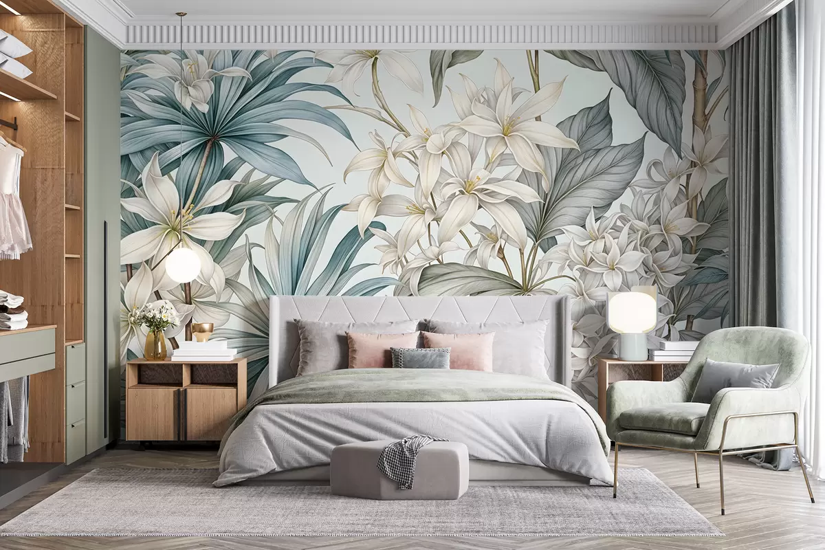 Fotomurales Estampado floral tropical con grandes flores blancas y azul claro, hojas verdes y fondo neutro Nr. w08318