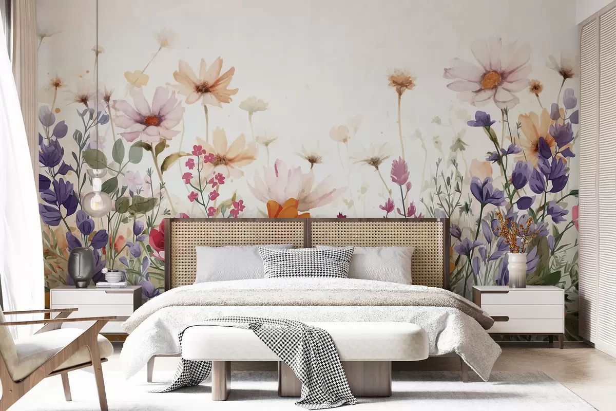 Fotomurales Un campo de coloridas flores silvestres abstractas incluyendo amapolas, margaritas y otras plantas en flor sobre fondo blanco Nr. w08333