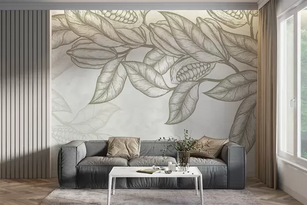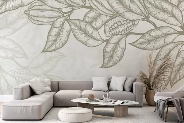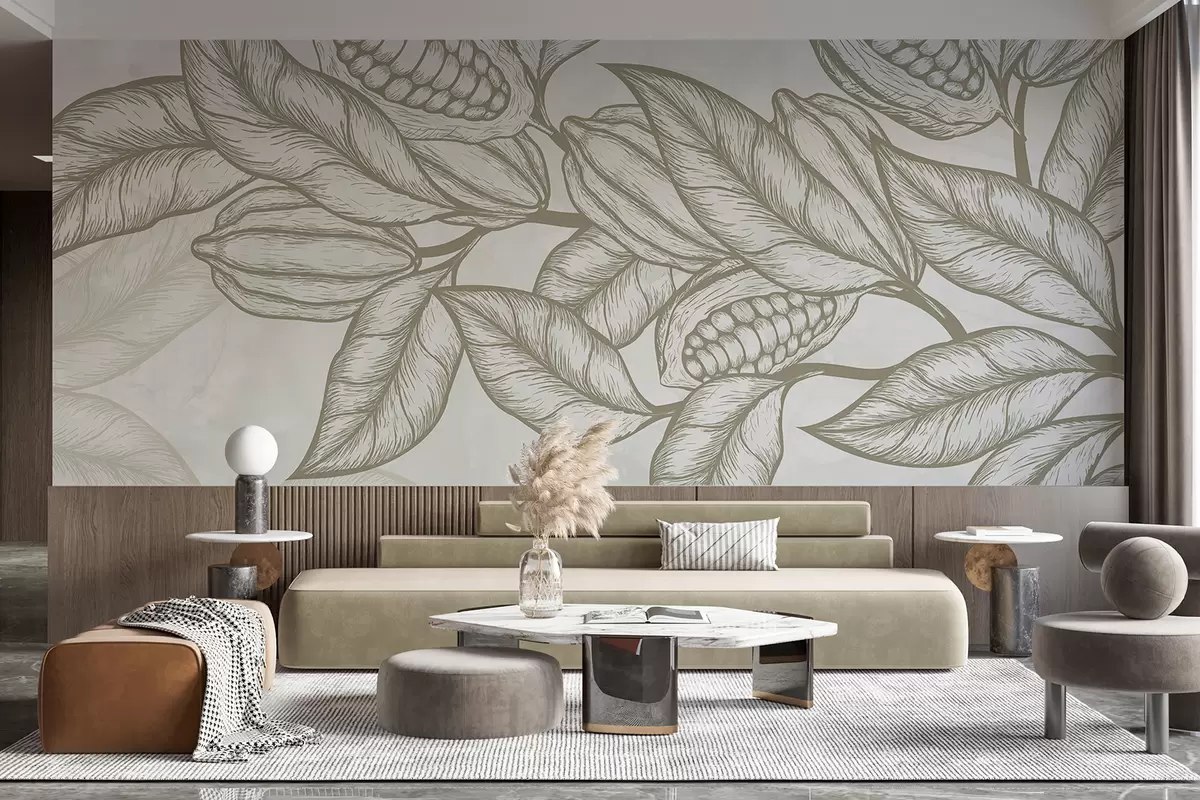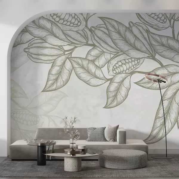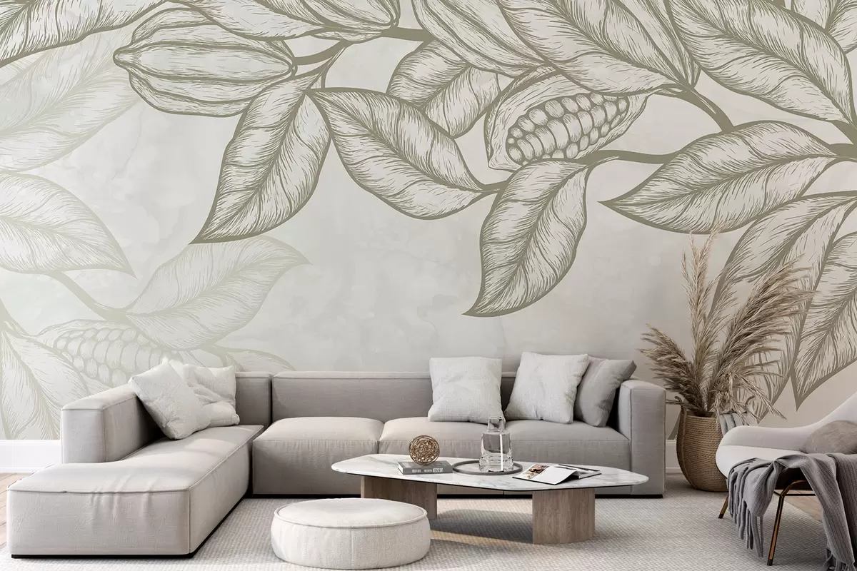 Fotomurales Dibujo lineal detallado de hojas y follaje de cacao en un estampado natural y orgánico Nr. w08334