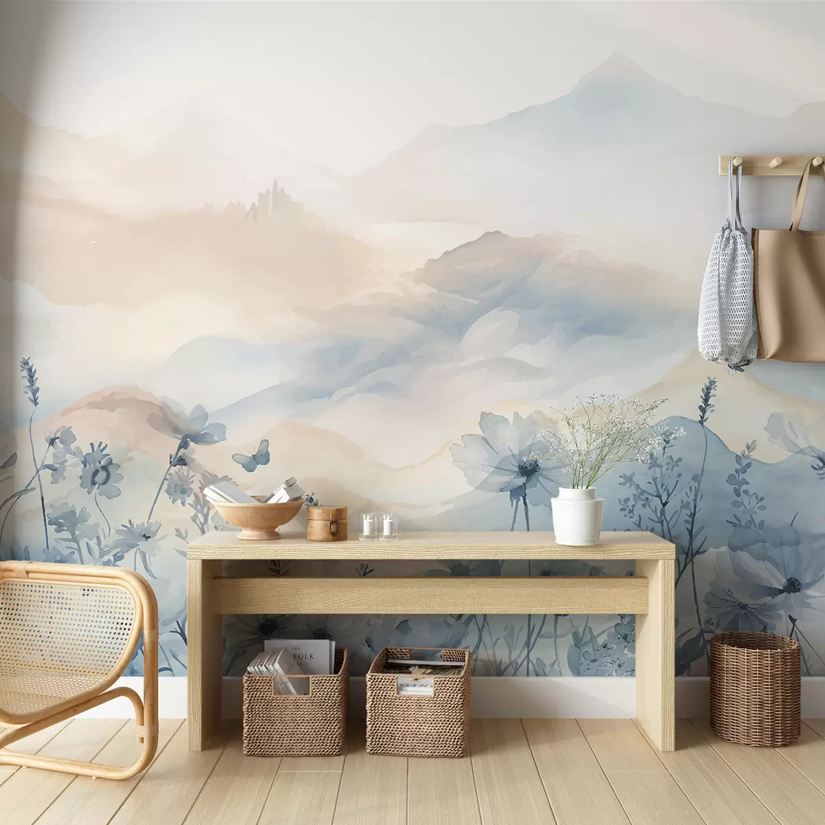 Fotomurales Un paisaje sereno con una cordillera brumosa al fondo, rodeada de un campo de delicadas flores azules Nr. w08339
