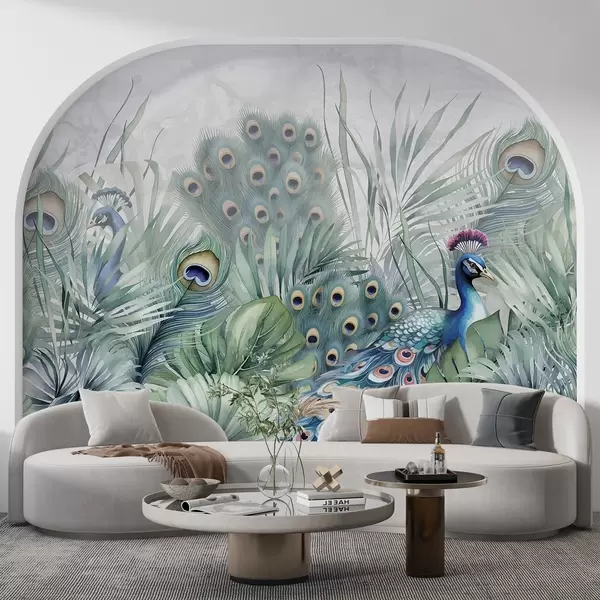 Fotomurales Un par de coloridos pavos reales rodeados de exuberante follaje verde acuarela y vibrantes flores sobre fondo gris Nr. w08345
