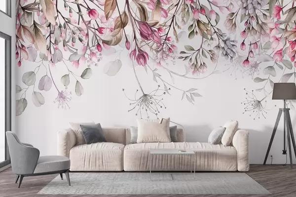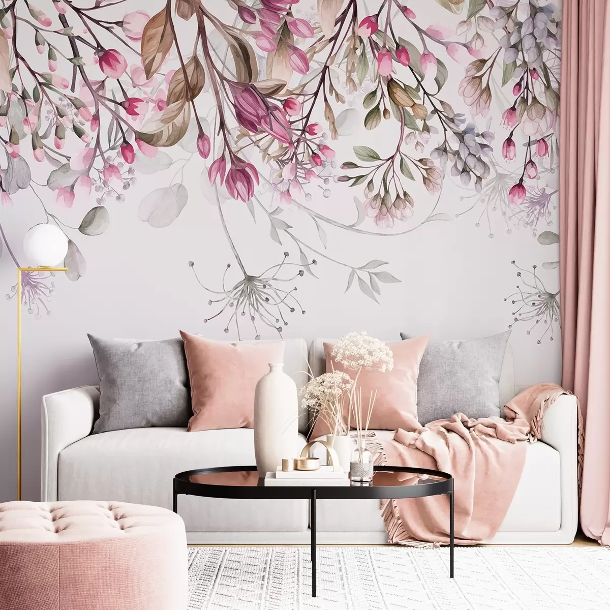 Fotomurales Delicadas ramas florales rosas y blancas con hojas y pétalos, sobre fondo gris pastel Nr. w08347