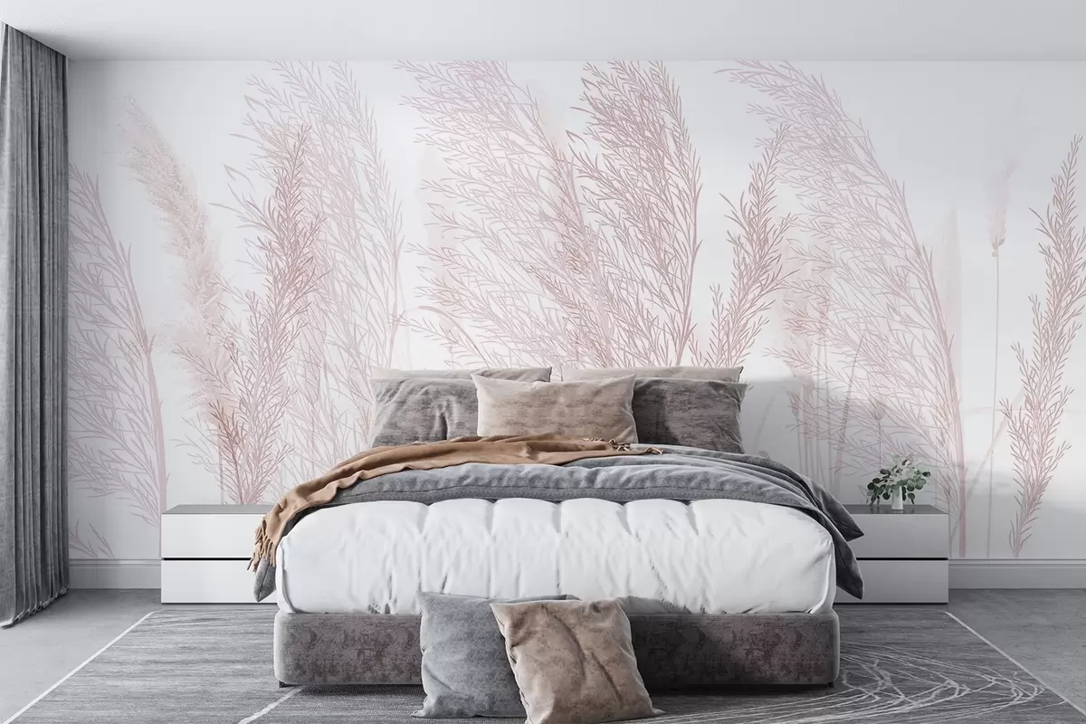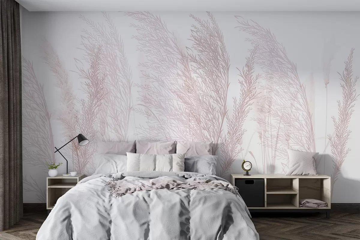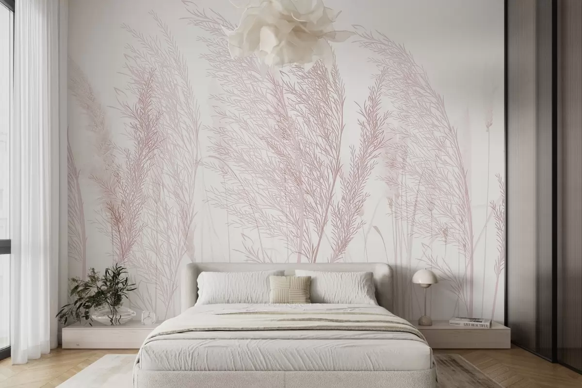Fotomurales Delicado rosa pastel suave hierba de la pampa contra un fondo blanco composición minimalista Nr. w08351