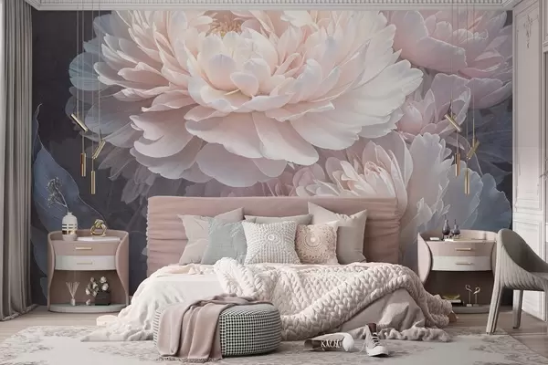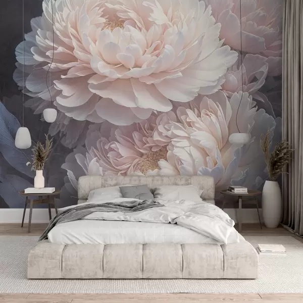 Fotomurales Primer plano de dos grandes y delicadas peonías rosas con pétalos y hojas suaves y esponjosos sobre un fondo difuminado Nr. w08382