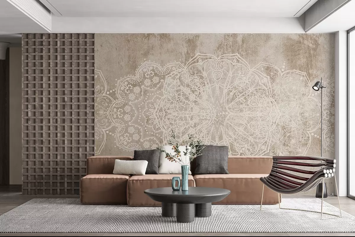 Fotomurales Un detallado e intrincado dibujo de mandala de encaje blanco sobre un fondo de pared de color marrón beige con textura de loft Nr. w08387v1