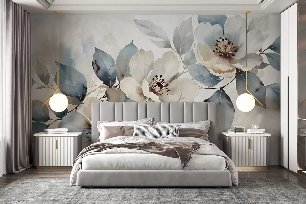 Fotomurales Delicado arreglo floral blanco y azul con textura de acuarela, con suaves pétalos y centros Nr. w08401