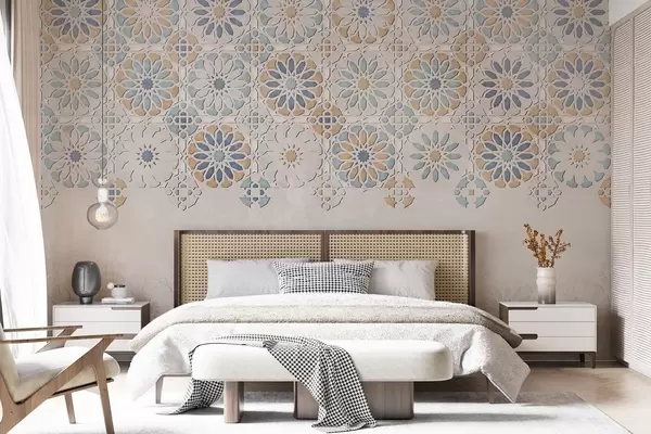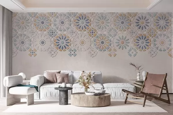 Fotomurales Una pared texturizada con un estampado repetido de diseños intrincados y ornamentados en tonos azules, grises y beige Nr. w08407