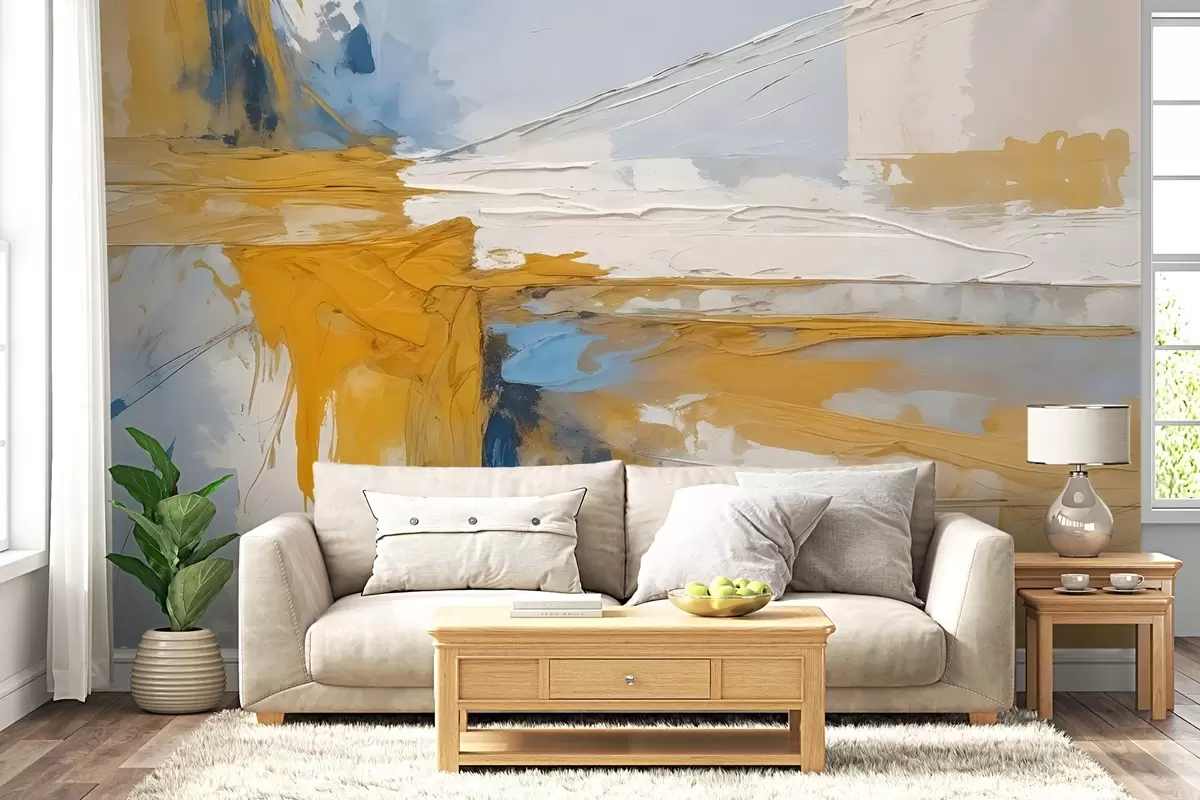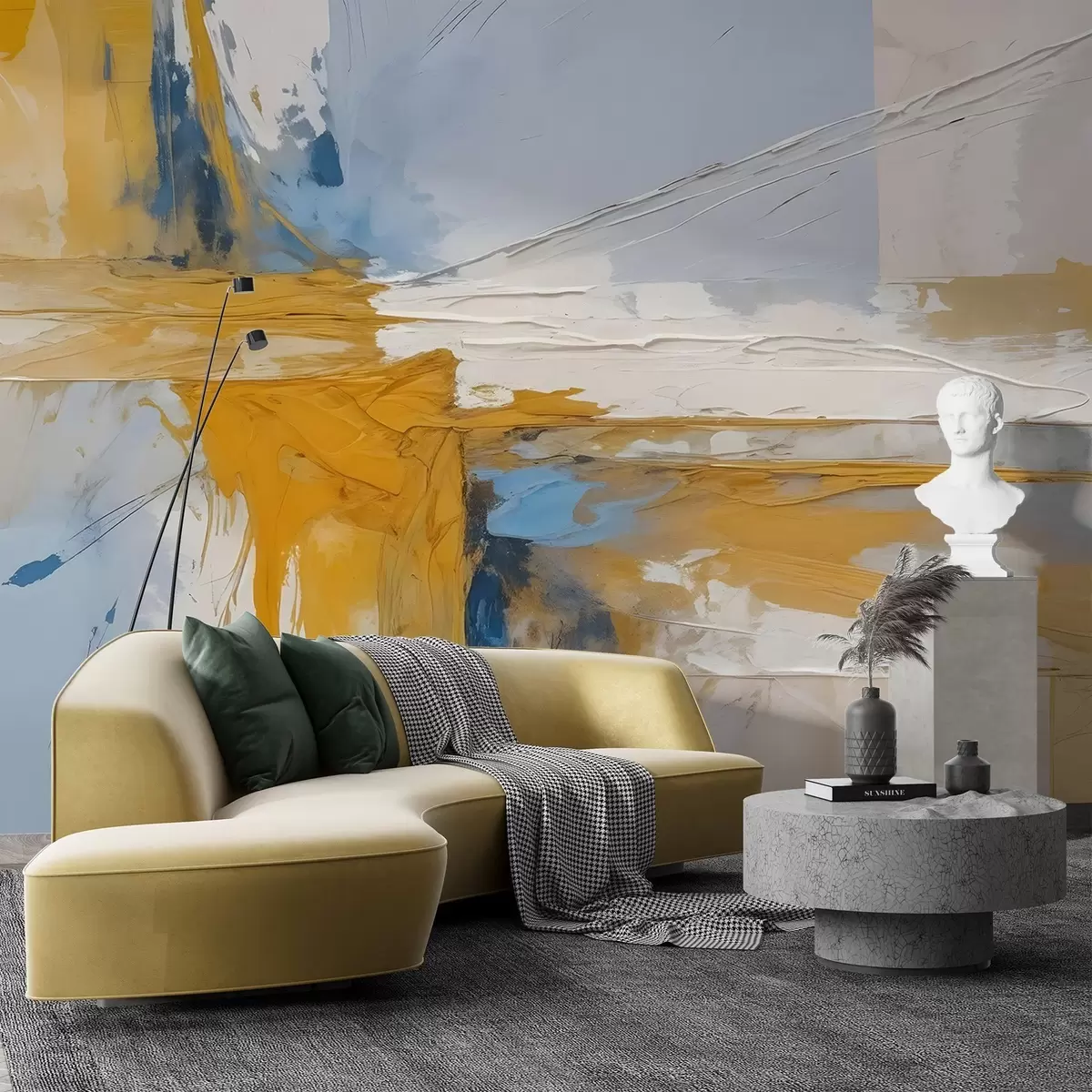 Fotomurales Composición minimalista de arte abstracto con atrevidas pinceladas de pintura amarilla, azul y blanca Nr. w08414