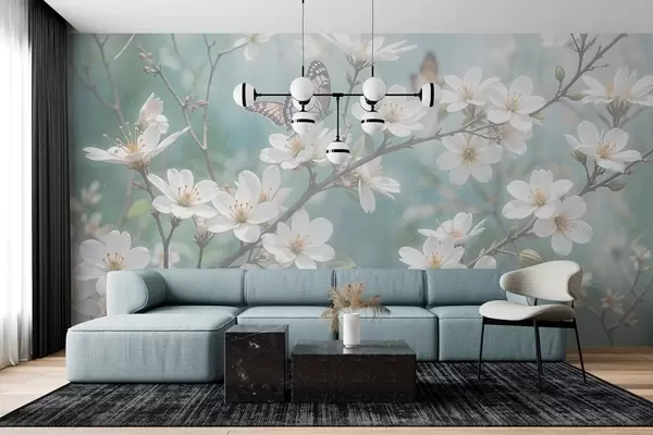 murales de pared Una mariposa blanca sobre una rama con delicadas flores blancas de cerezo en primer plano sobre un fondo difuminado w08421