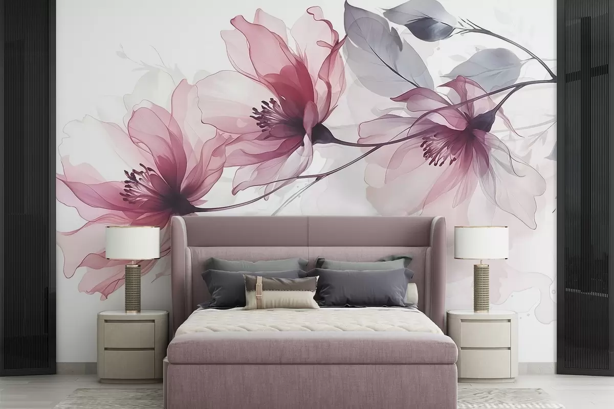 Fotomurales Delicadas flores transparentes rosas y grises con pétalos suaves y difuminados sobre fondo blanco Nr. w08429