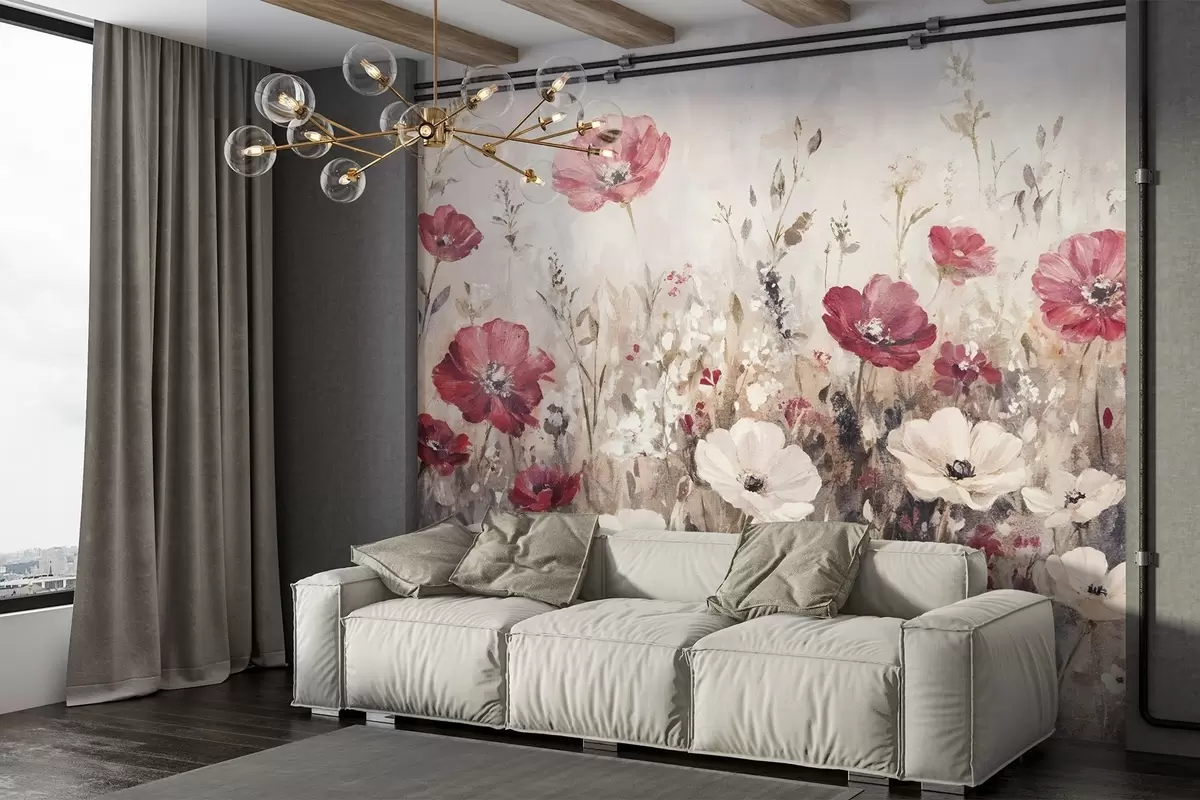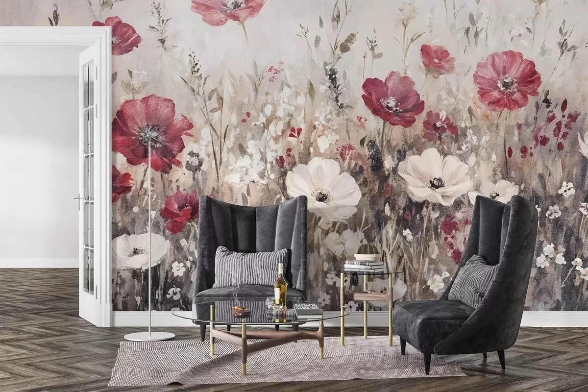 Fotomurales Un campo de vibrantes flores rojas y blancas sobre un fondo suave y brumoso en estilo de pintura al óleo Nr. w08438