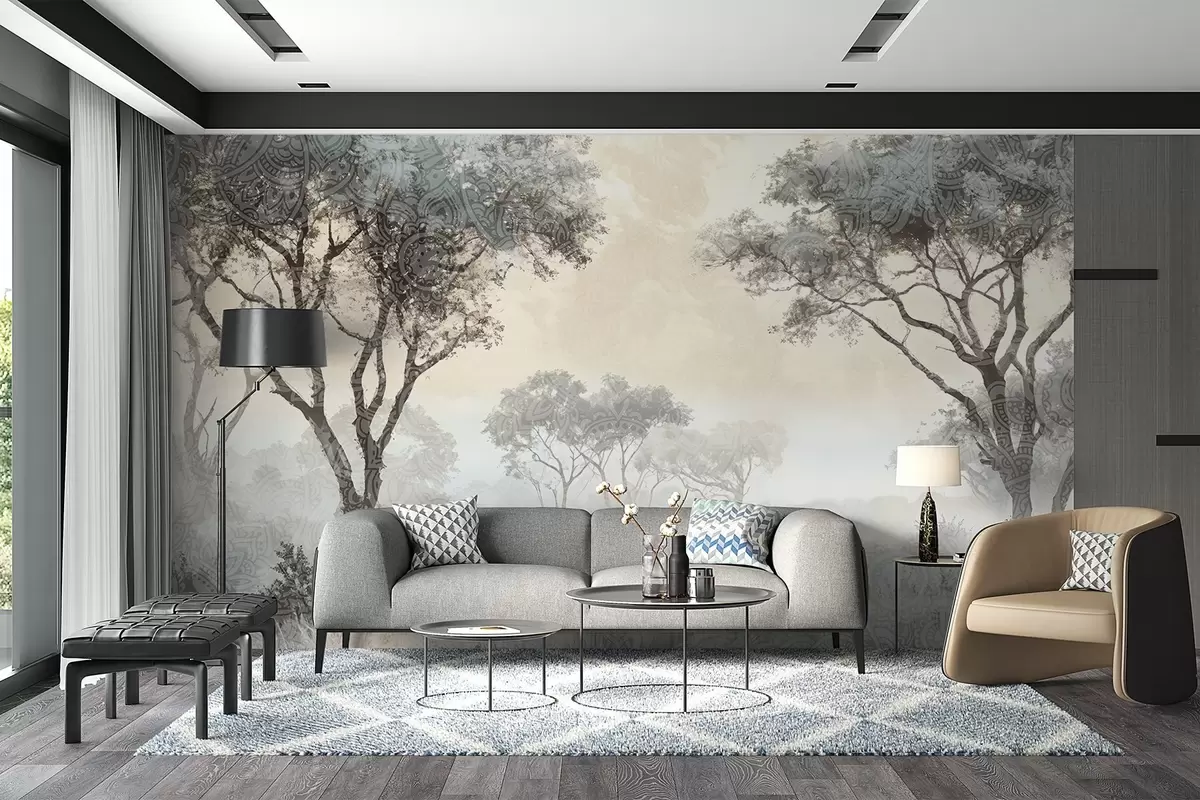 Fotomurales Un paisaje brumoso y sereno con árboles silueteados en primer plano y una suave niebla en tonos grises y beige Nr. w08442v1