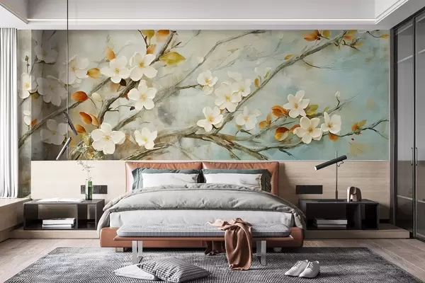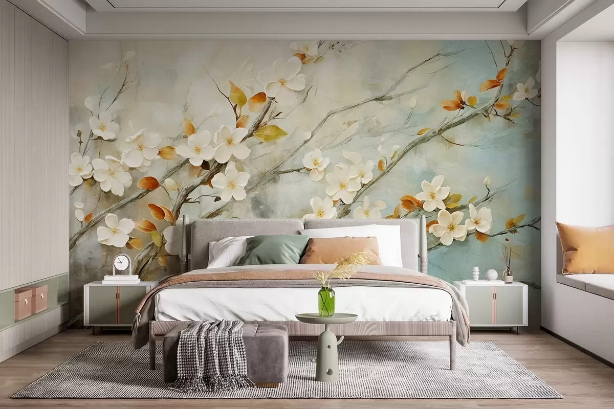 Fotomurales Flores blancas de cerezo en ramas sobre un fondo azul y verde suave en estilo de pintura al óleo Nr. w08444