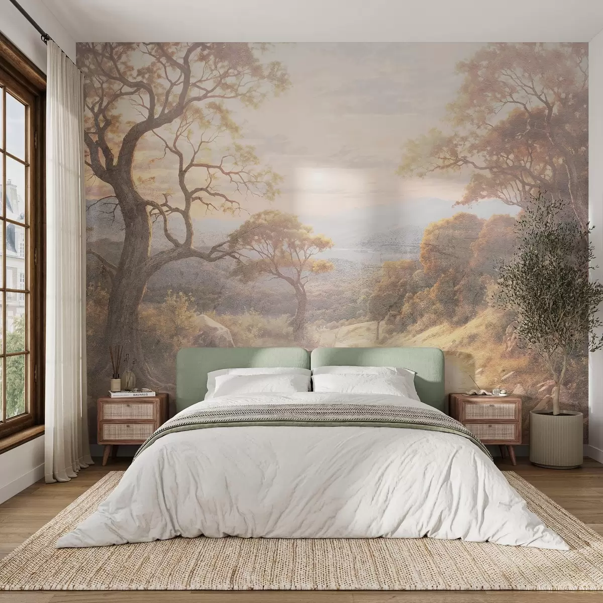 Fotomurales Un sinuoso camino de tierra a través de un frondoso bosque otoñal con árboles altos y retorcidos y la cálida luz del sol Nr. w08446