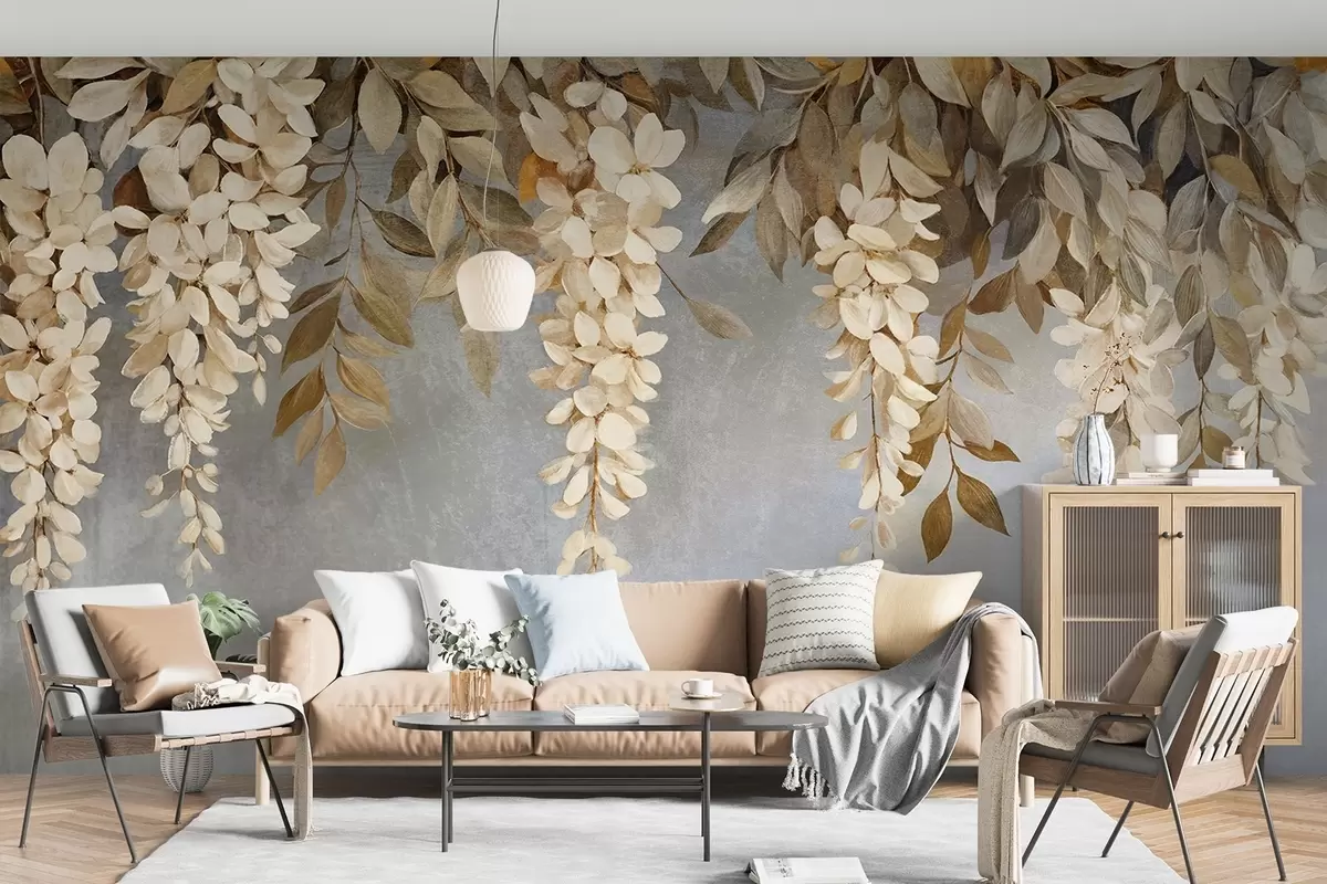 Fotomurales Delicadas flores de glicinia blancas y beige claro con follaje en cascada sobre un fondo gris suave Nr. w08531