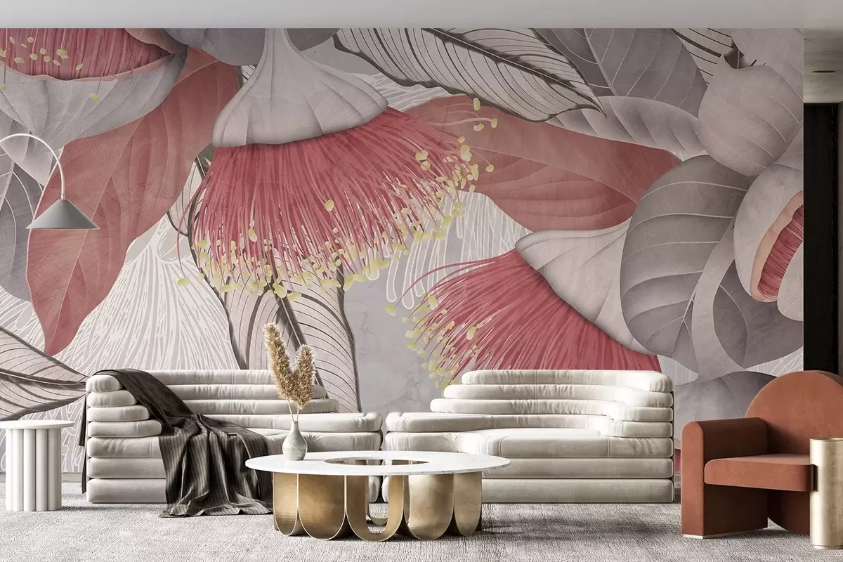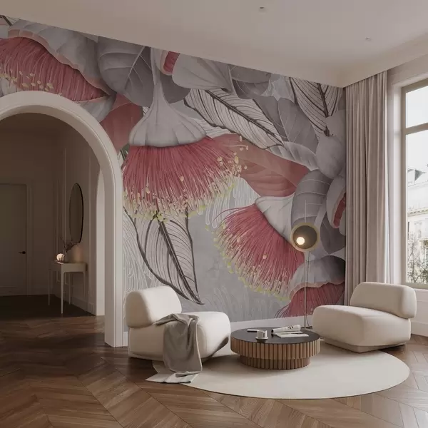 Fotomurales Ilustración botánica de grandes flores de eucalipto con largos estambres sobre fondo gris y blanco Nr. w08539