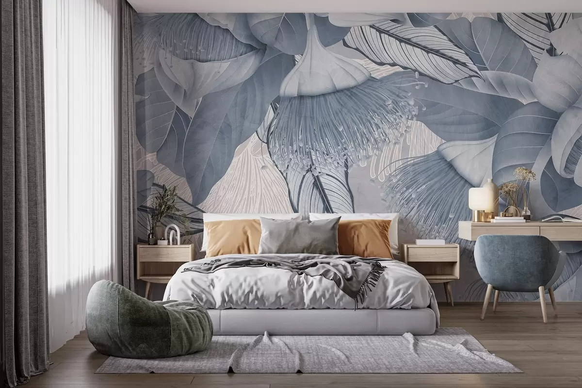 Fotomurales Ilustración botánica de grandes flores azules de eucalipto con largos estambres sobre un fondo gris y blanco Nr. w08539v1