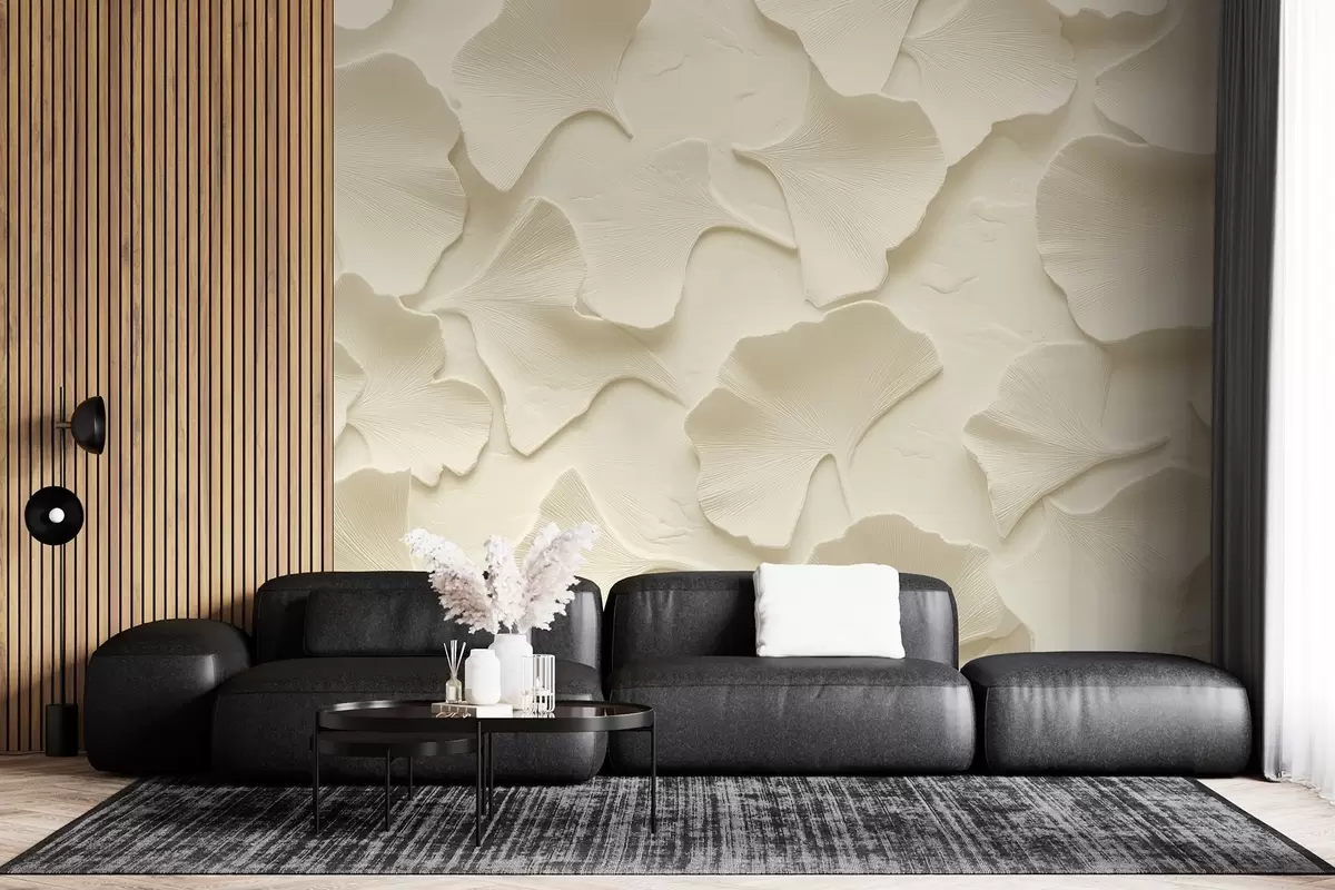 Fotomurales Estuco con delicado relieve de hojas de ginkgo sobre fondo beige suave Nr. w08560