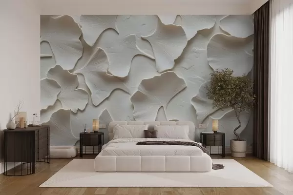 Fotomurales Estuco con delicado relieve de hojas de ginkgo sobre fondo blanco Nr. w08560v1