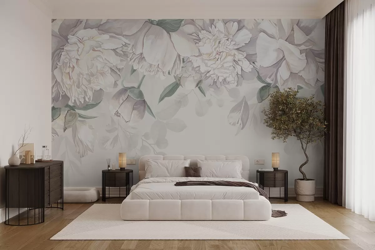 Fotomurales Delicadas peonías blancas y rosas pastel con hojas verdes, dispuestas en un suave y romántico fondo floral Nr. w08577