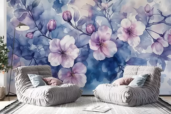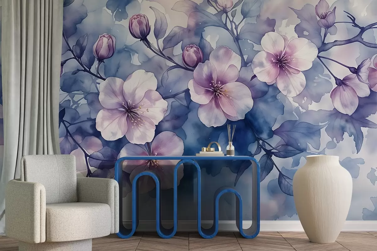 Fotomurales Delicadas flores rosas y moradas de imitación acuarela con pétalos suaves y difuminados sobre un fondo azul salpicado Nr. w08582